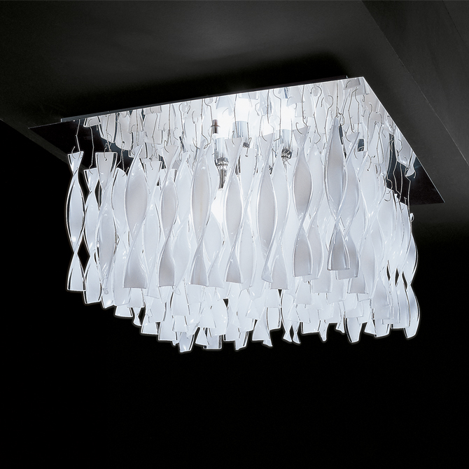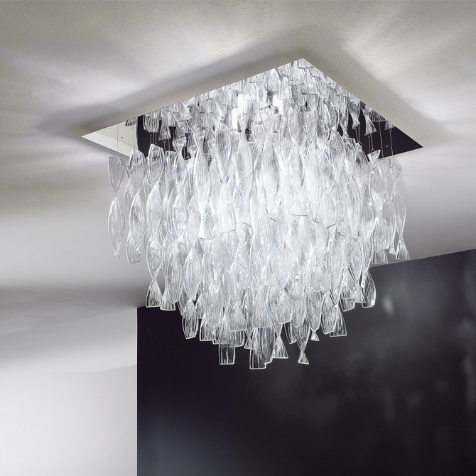 Das handwerkliche Können eines Glasermeisters zeigt sich in kleinen Glasstücken, die sorgfältig bearbeitet und zusammengesetzt werden, um ein fließendes Bild zu schaffen, in dem sich das Licht harmonisch reflektiert und verbreitet. Jedes Element ist das Ergebnis einer sorgfältigen und akribischen Verarbeitung, die Tradition und Design vereint, um einzigartige und faszinierende Objekte zu schaffen. Die Kollektion umfasst Hänge-, Wand- und Deckenleuchten, die jeden Raum mit einem eleganten,