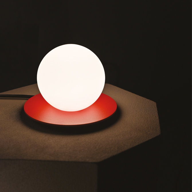 Nur wenige Elemente verbinden sich mit scheinbarer Einfachheit zu raffinierten Objekten, bei denen die Liebe zum Detail entscheidend ist. Geblasene Glaskugeln werden zu purem Licht, sanft auf farbigen Metallscheiben ruhend, die im Raum schweben, während in ihrem Inneren höchste technologische Qualität ihre Aufgabe erfüllt.