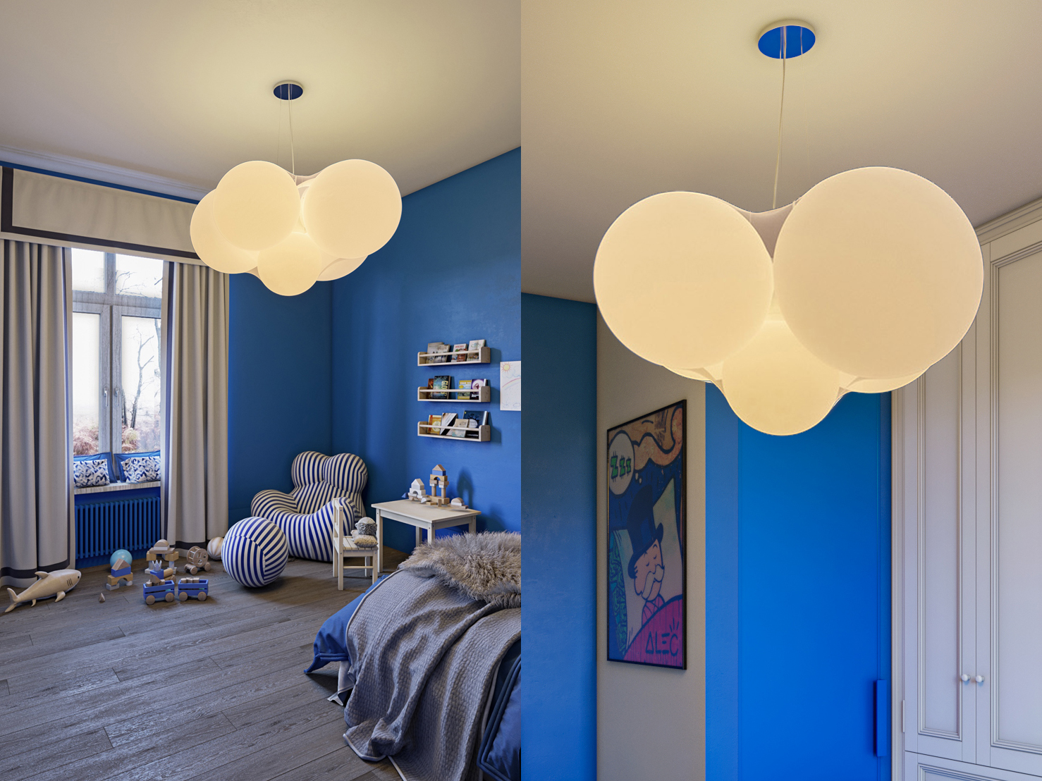 In this project for a private apartment in Russia, we see the installation of the beautiful pendant lamp Cloudy that fits perfectly to the playful style of the children’s bedroom. The cobalt blue recalls the sky on a summer day and our Cloudy floats in it. A lamp with sinuous volumes that in this project tie with some of the elements of this bedroom such as the chair in the corner and the pouffe in front of it.